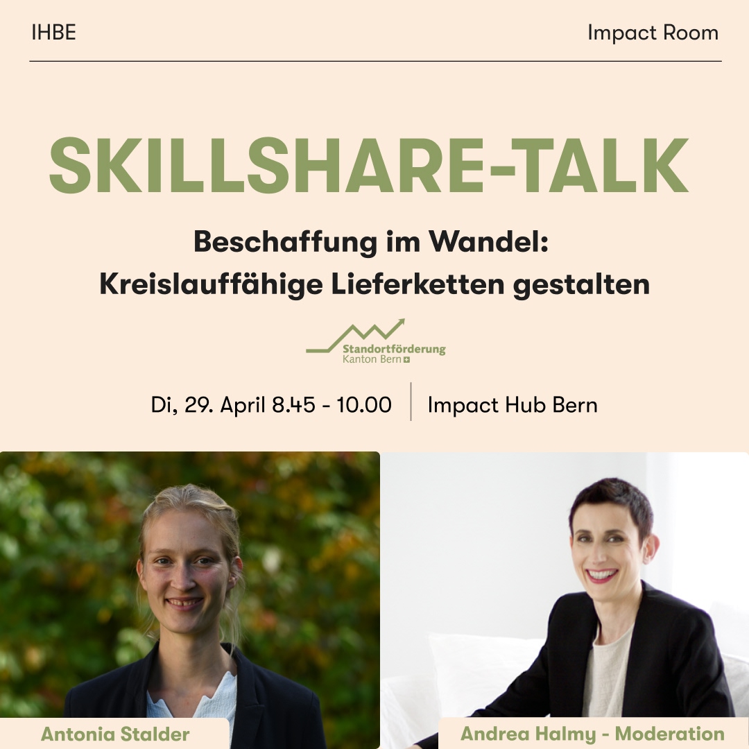 April 2025EventsApr316:30 - 17:15Community EventTour de Hub - Lerne uns kennen Impact Hub Bern DEApr317:15 - 17:45Hub-EventThirsty Thursday Impact Hub Bern DEApr1017:00 - 18:30Skillshare-TalkZukunftsfähig durch digitale Kompetenzen Impact Hub Bern DEApr2908:45 - 10:00Skillshare-TalkBeschaffung im Wandel: Kreislauffähige Lieferketten gestalten Impact Hub Bern DEApr3018:00 - 20:00Lean Innovation AcademyMasterclass #2: Mental & Business Mindset Impact Hub Bern DEWeekliesCake a BreakJeden Dienstag 15:30 Impact Hub Bern Für Community & TagesgästeStammtischJeden Mittwoch 12:00 Impact Hub Bern Für Community & Tagesgäste